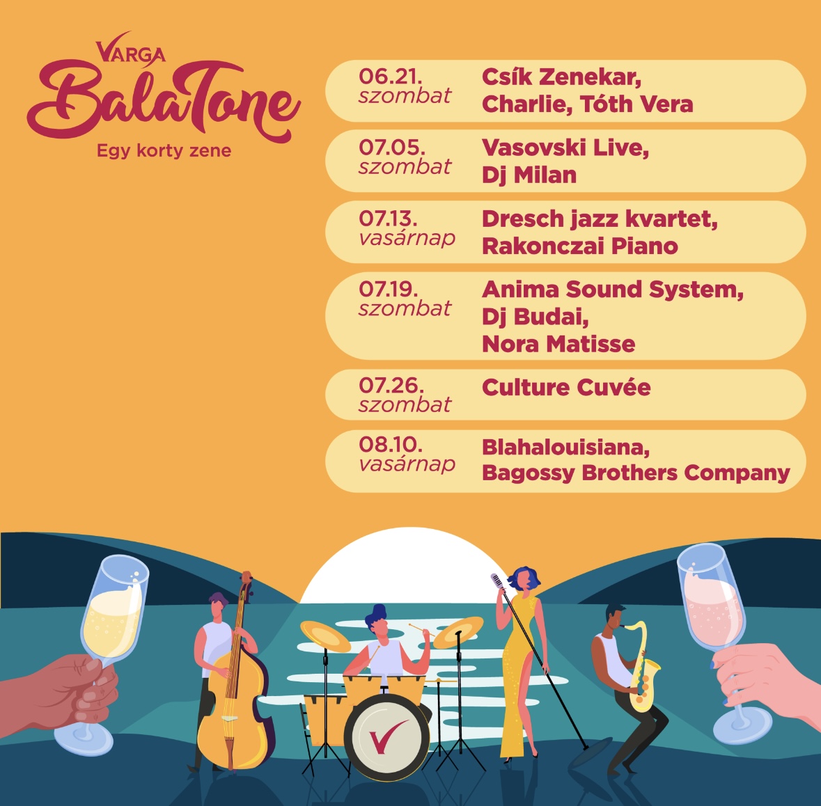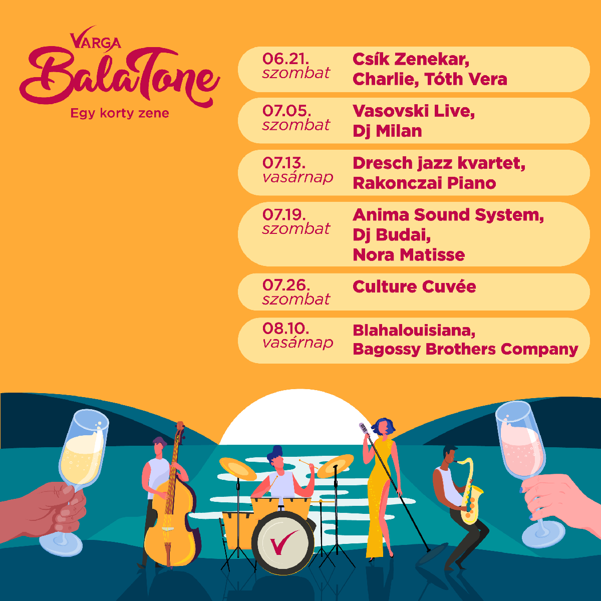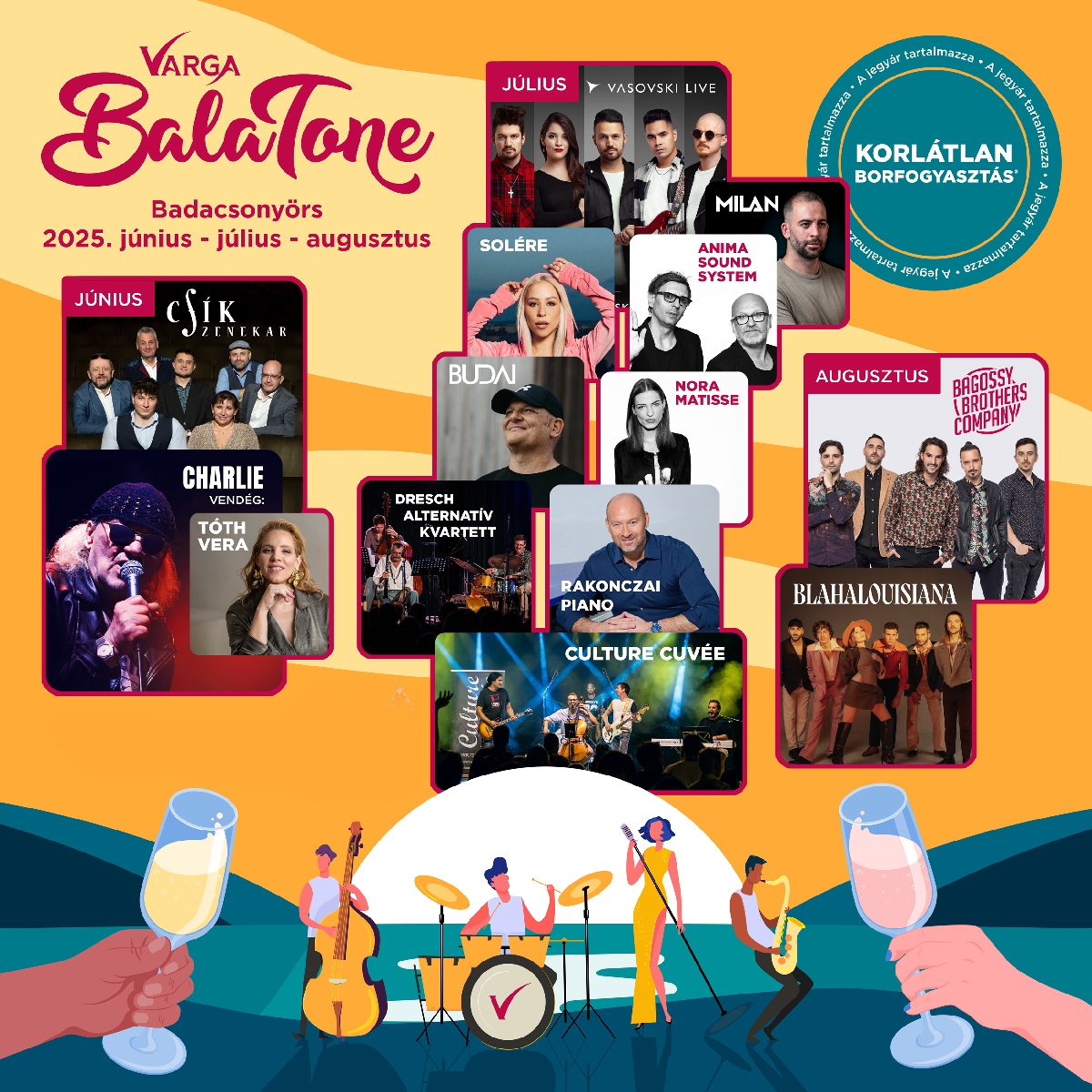 "Varga BalaTone: egy korty zene" – ahol a minőségi borok és a nagyszerű dallamok találkoznak, hogy felejthetetlen élményben legyen részetek! A koncertesték nálunk nemcsak a zenéről szólnak, hanem az együtt töltött időről, a természet közelségéről és arról az életérzésről, amit csak a Balaton-felvidék tud nyújtani. Találkozzunk idén nyáron Badacsonyörsön, egy pohár bor és egy korty zene mellett!